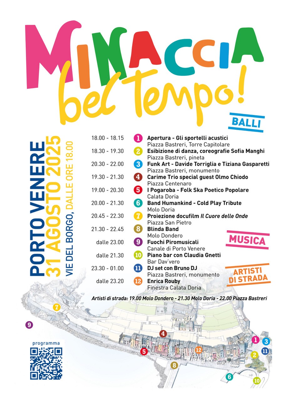 Domenica 31 agosto 2025 Porto Venere si accende di musica, danza, spettacoli e suggestioni visive con la nuova edizione di “Minaccia Bel Tempo”, l’appuntamento che porta arte e creatività nelle vie del borgo.